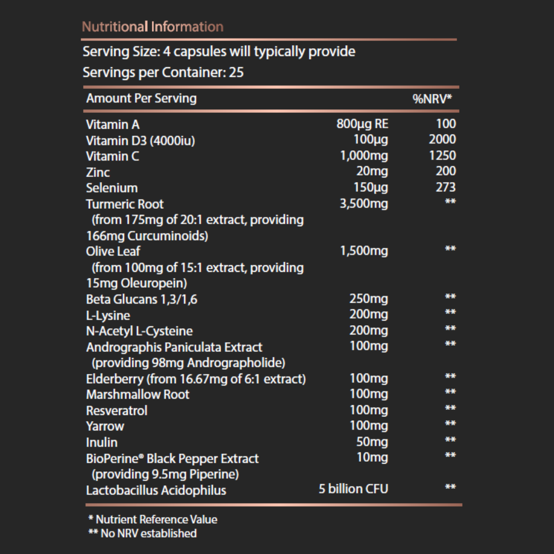 Capsule Shell (Hydroxypropyl Methylcellulose), Vitamin C (Calcium Ascorbate), Beta Glucan Powder, L-Lysine Hydrochloride, N-Acetyl L-Cysteine, Turmeric Root 20:1 Extract (95% Curcuminoids), Resveratrol, Andrographis Paniculata Extract (98% Andrographolide), Olive Leaf 15:1 Extract (20% Oleuropein), Marshmallow Root Powder, Yarrow Powder, Zinc Picolinate, Inulin, Vegan Vitamin D3 (Cholecalciferol), Selenomethionine, Lactobacillus Acidophilus, Elderberry 6:1 Extract, BioPerine® Black Pepper Extract (95% Piperine), Vitamin A (Retinyl Acetate).